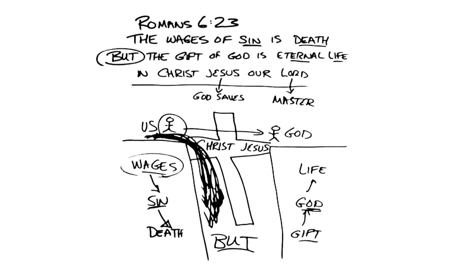 The big story of the Bible is God pursuing a relationship with people. May I share one sentence from it that summarizes how someone can have a relationship with him? The sentence is Romans 6:23, where it says this—I’m going to write it down: “The wages of sin is death, but the gift of God is eternal life in Christ Jesus our Lord.” Let me unpack it for you.